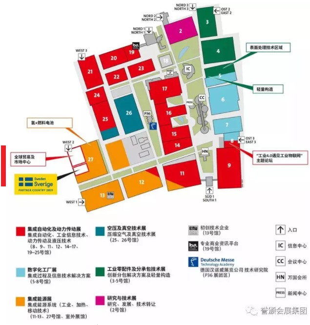 随着人工智能与工业的数字集成进度不断加快,2019汉诺威工业博览会再次精准把控业内发展脉络,以产业集成工业智能为主题,聚焦工业智能时代下,人与机器在下一阶段数字化转型中如何协同工作。本届展会聚焦六大主题展:集成自动化及动力传动展、数字化工厂展、集成能源展、工业零部件展、空压及真空技术展以及研究与技术展,进一步着重展示从机器学习、机器人技术、数字化和IT安全在能源行业的结合、供应链管理、轻量化设计和电动交通等多个关键主题。全馆布局图如下: