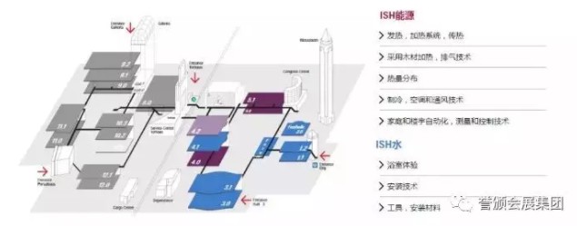 展馆共分两大类、八大展馆,分别是:能源类:发热、加热系统、传热展区,采用木材加热、排气技术展区,能量技术展区,制冷、空调和通风技术展区,家庭和楼宇自动化、测量和控制技术展区;水资源类(卫浴):浴室体验展区、卫浴安装技术展区、工具及安装材料展区;