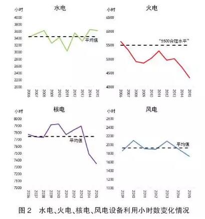 当前的电力供需形势宽松表现为火电、核电、风电等发电设备利用小时数的同步下降。从近十年历史数据看,由于水电出力主要受当期来水影响,其设备利用小时数虽上下波动,但偏离平均值的幅度不大;火电作为可控、可调的电量供给主体,利用小时数早已跌破所谓的“5500合理水平”,2015年仅为4329小时,为改革开放以来的最低值;核电利用小时数多年来较为平稳,但近三年受供给过剩影响,也出现大幅下滑;风电受发电装机快速增长及弃风限电等因素影响,近三年也出现利用小时数下降(见图2)。