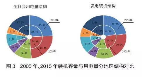 过去十年,全社会用电量的地区分布(按电网经营区域划分)变化是:华北、华东、华中、西南、南方等电网的占比变化很小,2005、2015年合计占比分别为84.2%、83.8%;东北占比从2005年的8.3%下降至2015年的6.3%(降幅为2.0个百分点);西北占比从2005年的7.4%上升至2015年的9.8%(升幅为2.4个百分点)。
