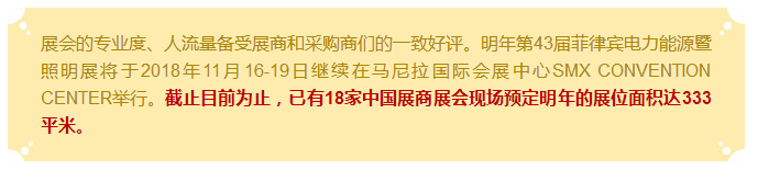 继第31届东盟峰会圆满落幕之际,11月16-19日马尼拉迎来第42届菲律宾电力能源暨照明展览会(IIEE 42ND ANC with 3E XPO 2017)。誉颁君作为此次展会中国总组展方,带领59家优秀的中国企业一起走进这座城市,参加年度行业盛会。下面带大家一起回顾下展会现场的盛况~