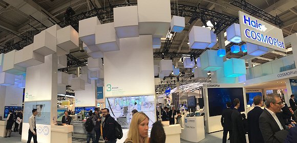 强调云平台能与制造设备进行集成的工业互联网,展现出更加全方位的趋势。海尔将大规模定制平台COSMOPlat的示范线搬到了展会现场:通过智能识别设备捕捉到用户的面部信息,屏幕上弹出系统智能分析后推荐的定制洗衣机产品型号,获得用户同意后,生产线开始备料、生产。十分钟后,一台带有用户照片和个性化签名的定制洗衣机便新鲜出炉。海尔的工作人员向界面记者介绍,COSMOPlat通过云端将工厂、研发中心、供应商和客户连在一起,实现了对六个流程环节、十个关键步骤的有效管理。