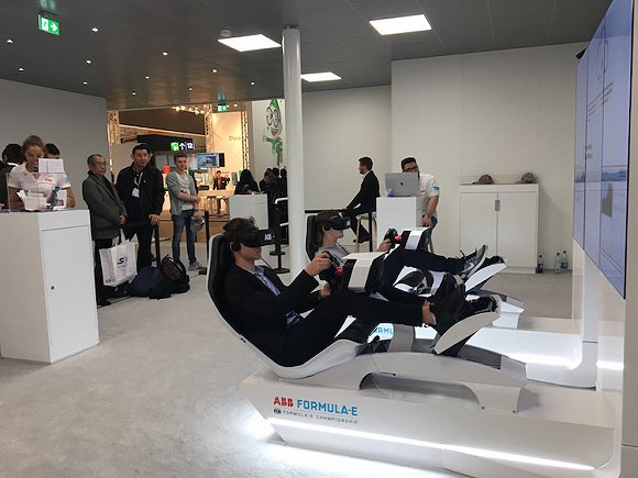 电力和自动化技术集团ABB在展会上通过VR让观众参与了电动方程式赛车(Formula E)的驾驶体验。VR技术的迅速发展不只给工业提供了更多可能性,也给展会经济注入了强心剂。汉诺威工博会是全球最大的工业展,每年都吸引了不少工业迷前来体验最新科技,观察工业趋势。VR给观众们提供了身临其境的可能。界面记者在展会现场观察到,有的展厅里大约每五个展台就会有一个提供VR体验的展方。